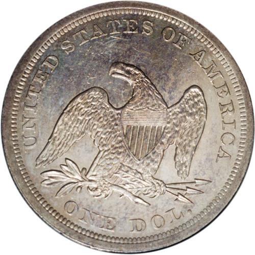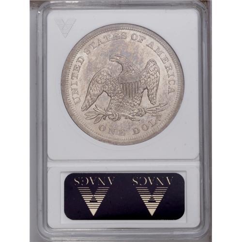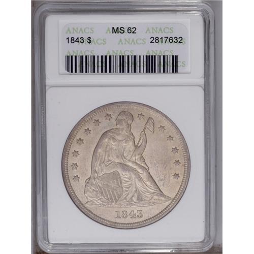 <B>1843<img border='0' src='http://www.heritagecoins.com/images/star.gif' width=10 height=10>$1 MS62 ANACS.</B></I> Uncirculated survivors of this early Seated dollar issue have a tendency to be somewhat prooflike and this piece is no exception. The strike is more than adequate in all areas and there are no particularly unsightly abrasions. While thought of as a common date among No Motto issues, the 1843 is quite scarce at this level of preservation.