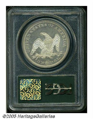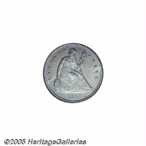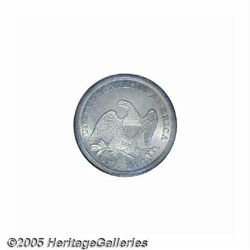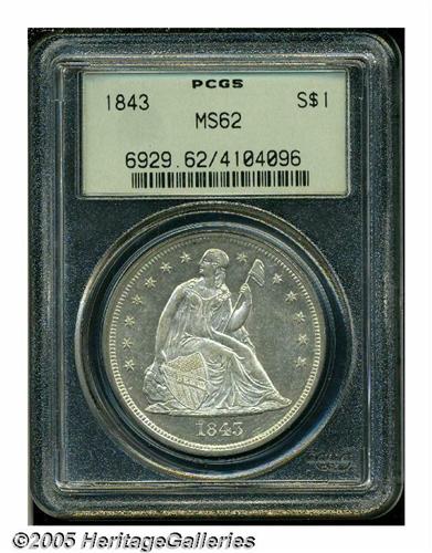 <B>1843<S$1> MS62 PCGS.</B></I> Despite its status as the most easily obtainable Seated Dollar from the 1840s in circulated grades, the 1843 (165,100 pieces struck) is anything but common in Mint State. Indeed, since the late 1980's, only 18 1843 dollars grading MS62 have made appearances through the major auction houses, with 27 pieces grading finer. The example in this lot is sharply struck, save for minor softness in the stars along the right (facing) border. The surfaces are virtually untoned, and reveal fields that are somewhat prooflike in appearance. There are a few small contact marks scattered about, the most prominent occurring on Liberty's chest. Population: 18 in 62, 15 finer (6/05).<BR><I>From The Dr. John L. Pellegrini Collection of Liberty Seated Dollars.</B></I>