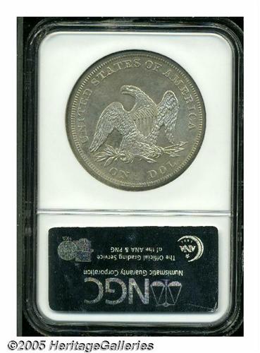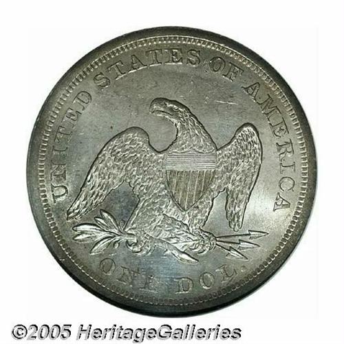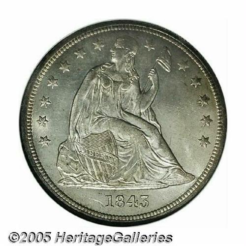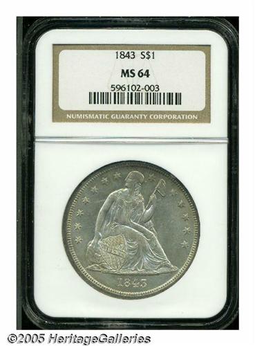 <B>1843<S$1> MS64 NGC.</B></I> A common coin in lower circulated grades but definitely difficult to locate in the better grades of Mint State. In fact, the 1843 is very elusive in any of the Uncirculated grades and is unknown in finer conditions at either service. This is a frosted, highly lustrous example that has just a hint of natural patina circling the rims on each side. Essentially mark-free, some softness of definition on the obverse stars and the eagle on the reverse limits the grade. An exceedingly rare opportunity for the Seated Dollar specialist. Population: 8 in 64, 0 finer (4/05).