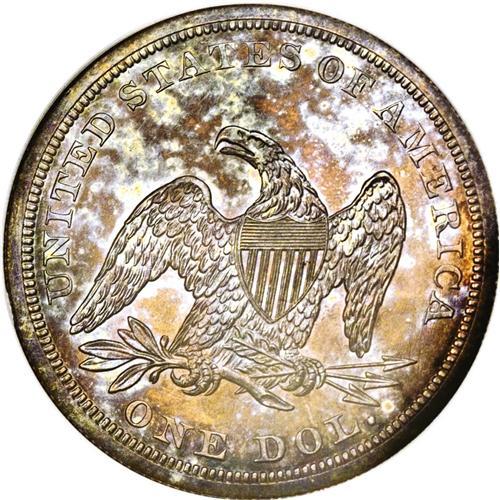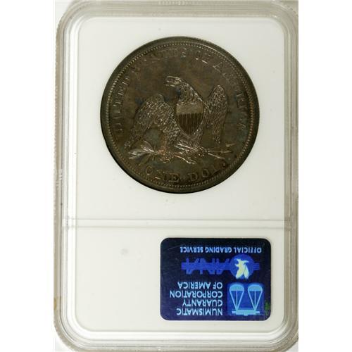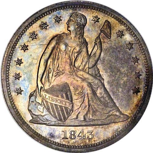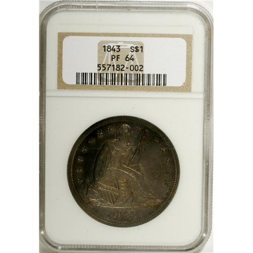 <B>1843 S$1 PR64 NGC.</B></I> In 1841, the owners of a mine in Davidson County, North Carolina sent deposits of silver to the mint in Philadelphia. The mine owners informed Mint Director Robert Maskell Patterson that future silver output would be "largely productive." This was either wishful thinking, or the owners found a closer outlet for the silver they extracted from the argentiferous carbonate of lead, as no further mention of this source of domestic silver was found in future Mint reports. In 1843, silver supplies remained a problem, with most of the bullion used by the Mint for coinage restricted to foreign bullion, Mexican silver coins, European coins, and silver plate. Nevertheless, enough silver was received by the Mint to strike more than 6 million half dollars, which were the workhorse denomination in circulation in the early 19th century. Only 165,100 business strike Seated dollars were produced with a mere handful of proofs. Only 15-25 pieces are believed to have been struck, and the 1843 is the second rarest date since the beginning of the series, second only to the 1841.<BR> This is a deeply mirrored proof that displays equally deep toning over each side that partially subdues the reflectivity from the coin's fields. Rich gray, golden, and lilac toning covers each side with significantly different configurations of the color schemes on obverse and reverse. Only the slightest hairlines are evident with strong magnification, again the toning is responsible for dampening the effects of past attempts at "improvement." The reverse is once again struck from the stock proof reverse used throughout the 1840s with the diagnostic dual flaws on the right side of the final A in AMERICA. Census: 3 in 64, 0 finer (11/06).<BR><BR><b>Shipping:</b> Coin/Currency (<a target="_blank" href="http://www.heritageauctions.com/common/shipping.php">view shipping information</a>)