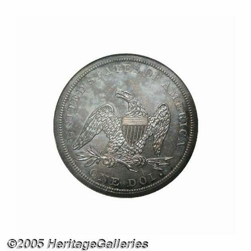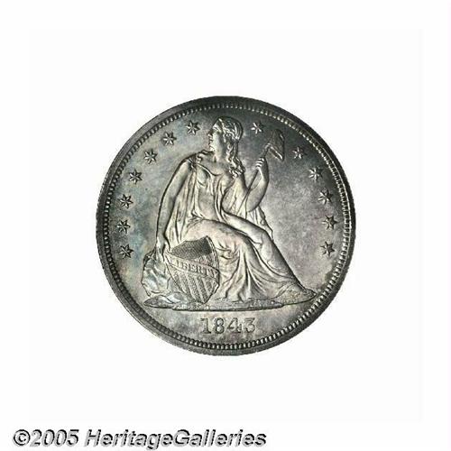 <B>1843<S$1> PR64 NGC.</B></I> In 1841, the owners of a mine in Davidson County, North Carolina sent deposits of silver to the mint in Philadelphia. The mine owners informed Mint Director Robert Maskell Patterson that future silver output would be "largely productive." This was either wishful thinking, or the owners found a closer outlet for the silver they extracted from the argentiferous carbonate of lead, as no further mention of this source of domestic silver was found in future Mint reports. In 1843, silver supplies remained a problem, with most of the bullion used by the Mint for coinage restricted to foreign bullion, Mexican silver coins, European coins, and silver plate. Nevertheless, enough silver was received by the Mint to strike more than 6 million half dollars, which were the workhorse denomination in circulation in the early 19th century. Only 165,100 business strike Seated dollars were produced with a mere handful of proofs. Only 15-25 pieces are believed to have been struck, and the 1843 is the second rarest date since the beginning of the series, second only to the 1841. The total number of proofs certified by NGC and PCGS shows that 15 pieces have been certified. However, we estimate that a significant number of these are resubmissions that have not been removed from the population reports as only five proofs have been offered at public auction since 1992.<BR> This is a deeply mirrored proof that displays equally deep toning over each side that partially subdues the reflectivity from the coin's fields. Rich gray, golden, and lilac toning covers each side with significantly different configurations of the color schemes on obverse and reverse. Only the slightest hairlines are evident with strong magnification, again the toning is responsible for dampening the effects of past attempts at "improvement." The reverse is once again struck from the stock proof reverse used throughout the 1840s with the diagnostic dual flaws on the right side of the final A in AMERICA.<BR><I>From The Dr. John L. Pellegrini Collection of Liberty Seated Dollars.</B></I>