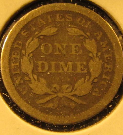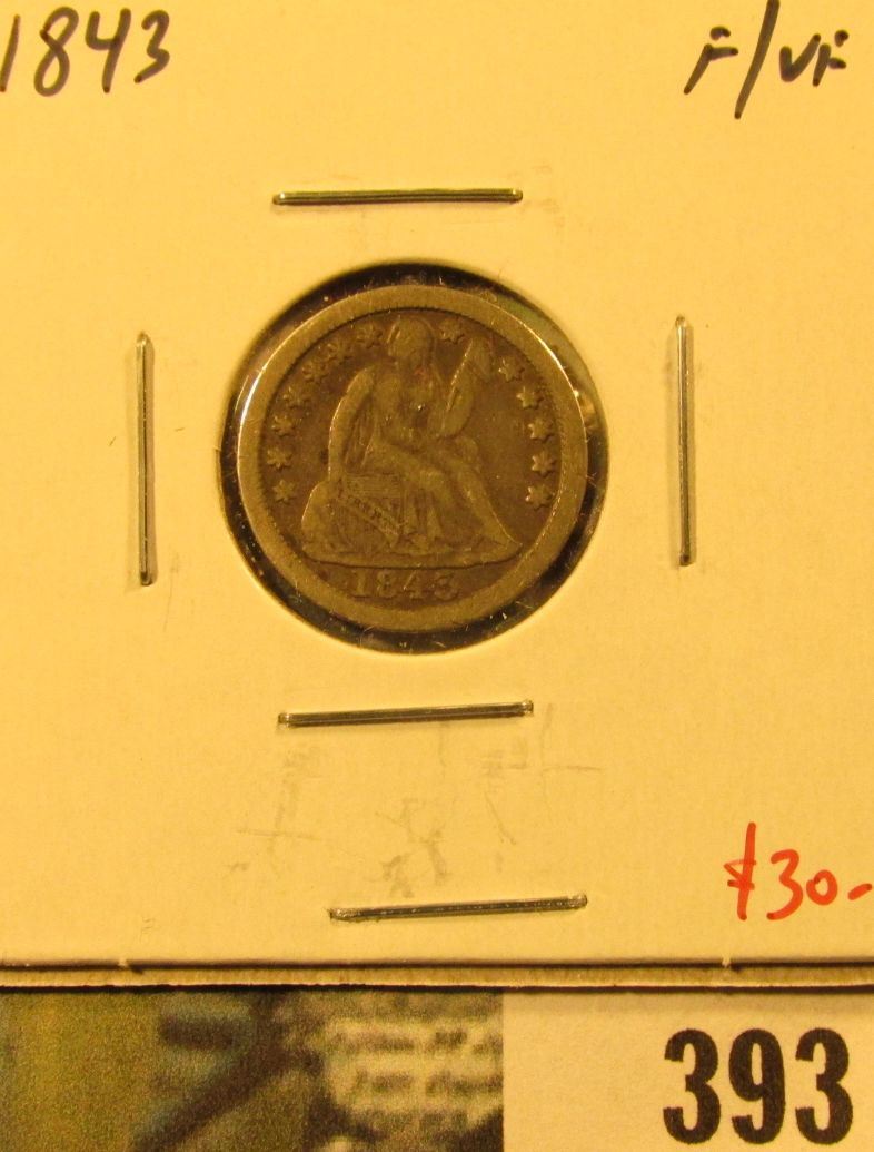 1843 Seated Liberty Dime, F/VF, value $30