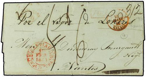 1843 Stamp-less envelope to FRANCE written from SANTIAGO DE CUBA with BRITISH POST OFFICE datestamp on reverse and SPANISH POST OFFICE SANTIAGO/ISLA D´CUBA datestamp in red, charged "3/2" for the British steamer, routed via England with boxed hand-struck PACKET LETTER, French entry cachet, taxed "56" on arrival in France with NANTES arrival. Fine item.