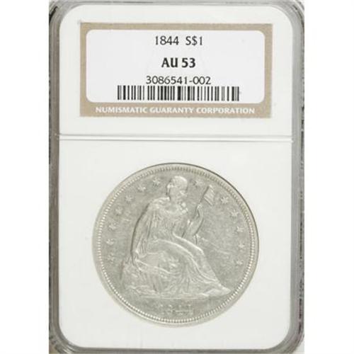 <B>1844 $1 AU53 NGC.</B></I> Well struck with significant remaining reflectivity in the silver-white fields. Light, scattered marks and a measure of rub affect the surfaces, but the overall eye appeal is solid. One of just 20,000 pieces coined.<BR><BR><B>Coin Engraver:</B> Christian Gobrecht<BR><BR><b>Shipping:</b> Coins & Currency (<a target="_blank" href="http://www.heritageauctions.com/common/shipping.php">view shipping information</a>)