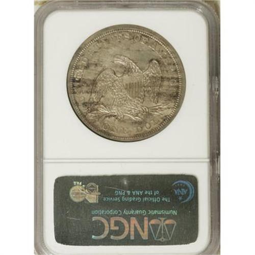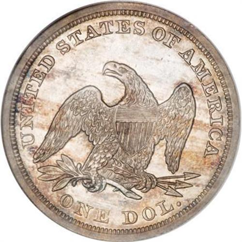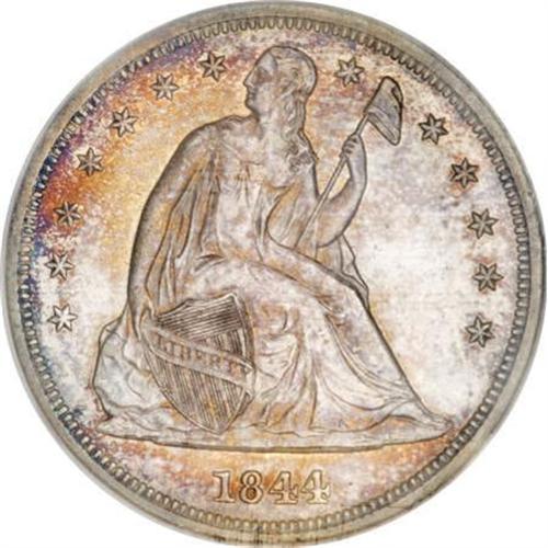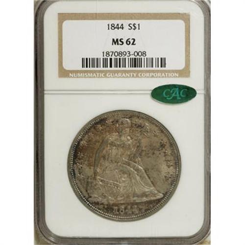 <B>1844 $1 MS62 NGC. CAC.</B></I> The 1844, coming from a small mintage of 20,000 business strikes, is in demand in all levels of preservation. This gorgeous MS62 example exhibits a pleasing mix of orange-gold, purple, and gray patination that takes on a somewhat streaked appearance on the reverse. The design features are well defined, and the lustrous surfaces reveal just a few minor ticks that barely prevent the next highest grade. Census: 4 in 62, 5 finer (2/08).<BR><I>From The Queller Family Collection of Silver Dollars.</B></I><BR><BR><B>Coin Engraver:</B> Christian Gobrecht<BR><BR><b>Shipping:</b> Coins & Currency (<a target="_blank" href="http://www.heritageauctions.com/common/shipping.php">view shipping information</a>)