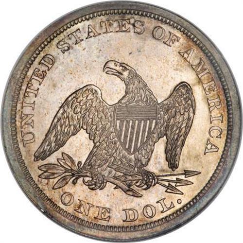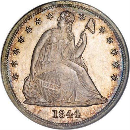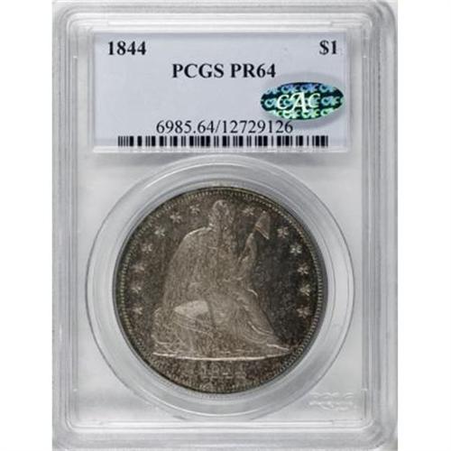 <B>1844 $1 PR64 PCGS. CAC.</B></I> For the 1844, it is a simple matter to distinguish proofs from business strikes. This is because the commercial dies have prominent diagnostics. Liberty's shield is a "quad stripes" variety, caused by a die doubled obverse. The reverse features prominent die lines beneath the wings, unforgettably described as the "armpit variety" in Breen's 1988 <I>Encyclopedia</B></I>. Only 20,000 business strikes were coined, but survivors carry little premium in grades through XF. AU and better examples sell for significantly higher prices than No Motto type coins, such as the 1859-O and 1860-O.<BR> The number of proofs produced is unknown, but undoubtedly low. In 2006, Duncan Lee listed the 1844 as the sixth rarest proof date in the series. All appear to be coined with the "common reverse" identified by die chips near the final A in AMERICA. Another pick-up point for this reverse is the third line of the first vertical stripe, which extends to the third horizontal line.<BR> The obverse diagnostics are less familiar, but there are tiny die spikes from the drapery near Liberty's raised elbow, and the center of the date has a sunken appearance. Apparently, the date was entered into the obverse die by rocking the logotype punch back and forth, instead of applying it with an even force. Thus, the top and bottom of the date digits are deeply impressed, while the center of the digits display lower relief.<BR> The present piece is a splendid example. The strike is essentially full, and the rich autumn-brown and ice-blue patina is highly attractive. For those who track pedigrees of this rare proof issue, we note a hair-thin mark in the field near the base of the drapery above the knee. Since 2000, Heritage has offered only three other examples, including an impaired specimen and one appearance each in our 2007 and 2008 FUN Signature auctions. Population: 1 in 64, 0 finer (2/08).<BR><I>Ex: Golden Jubilee Sale (B. Max Mehl, 5/1950), lot 814; Amon G. Carter, Jr. Collection (Stack's, 1/1984), lot 250.<BR>From The Queller Family Collection of Silver Dollars.</B></I><BR><BR><B>Coin Engraver:</B> Christian Gobrecht<BR><BR><b>Shipping:</b> Coins & Currency (<a target="_blank" href="http://www.heritageauctions.com/common/shipping.php">view shipping information</a>)
