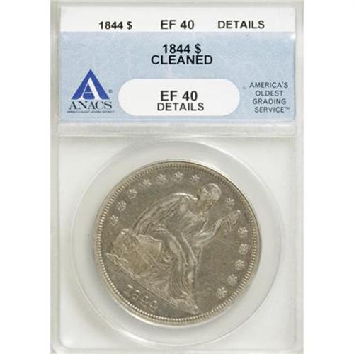 <B>1844 $1 --Cleaned--ANACS. XF40 Details.</B></I> NGC Census: (5/107). PCGS Population (10/123). Mintage: 20,000. Numismedia Wsl. Price for NGC/PCGS coin in XF40: $475. (#6930)<BR><BR><B>Coin Engraver:</B> Christian Gobrecht<BR><BR><b>Shipping:</b> Coins & Currency (<a target="_blank" href="http://www.heritageauctions.com/common/shipping.php">view shipping information</a>)
