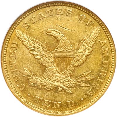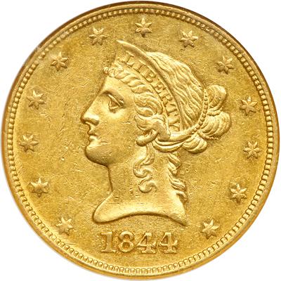 1844 $10 Liberty. NGC graded AU-58. 6,361 pieces struck. Choice and attractive. Very low mintage for the 1844 Ten Dollar. This serves as a good indicator of its rarity, but it isn't the only reason why so few high grade examples are known today. The years from 1838 through 1844 were ones of economic hardwhip and outright starvation during what came to be called The Hard Times. As a result, gold coins of this era were usually not saved because they had a lot of purchasing power. The 1844 is considered "prohibitively rare" above Extremely Fine condition. Few are known in About Uncirculated to mint condition and this shows in the population figures: Pop 6; 2 finer; 1 in 61; 1 in 63. (PCGS # 8590).
