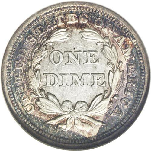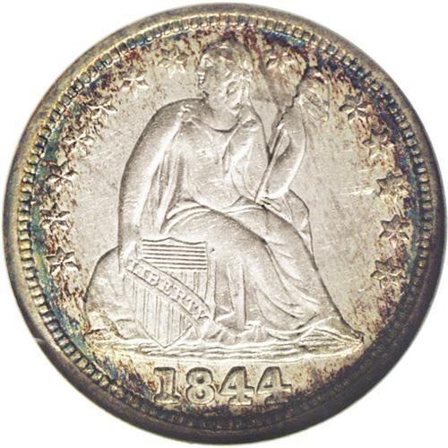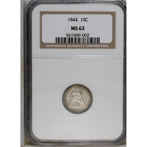 <B>1844<10C> MS62 NGC.</B></I> It is definitely not the norm when the Philadelphia Mint produces both of the lowest-mintage issues for a type. The 1844 is the second-rarest issue of the type, following only the 1846. NGC and PCGS have certified only 11 Uncirculated pieces from the 72,500 coins struck. This example is well struck on almost all of the design elements, except for a few of the obverse stars. Distracting abrasions are absent. Light-gray in the centers, with speckled dark-green, red-brown, and deep purple patina at the peripheries. A coin for the true connoisseur of Seated Liberty dimes. Census: 2 in 62, 4 finer (8/06).
