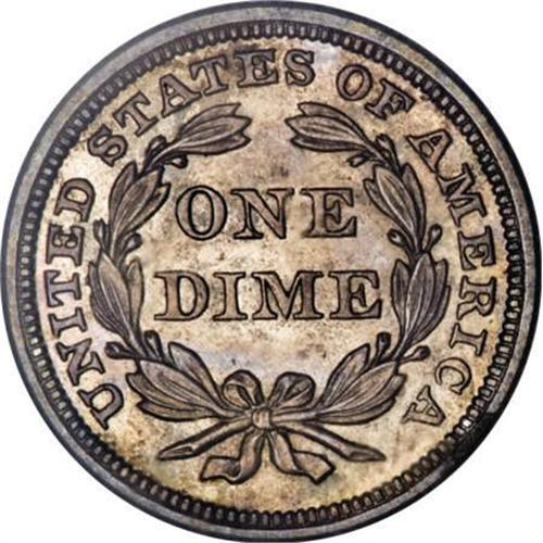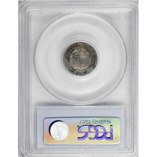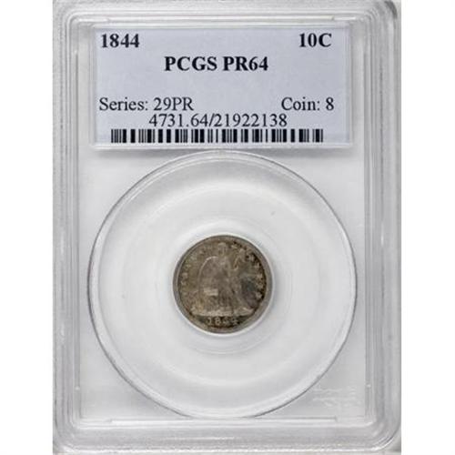 <B>1844 10C PR64 PCGS.</B></I> Although proof coinage totals for many early U.S. issues before 1858 are either sketchy or nonexistent, Walter Breen and later authorities have estimated that perhaps eight pieces of the Seated Liberty dime were produced. Heritage is pleased and proud to offer two proof 1844 dimes in the present sale, the Philip Kaufman example and the present piece, graded PR64 by PCGS (previously PR63 PCGS). This coin issue is well-known to numismatists as the "Little Orphan Annie" dime, a case of early hype attributed to Kansas City coin dealer Frank C. Ross.<BR> The business strike 1844 Seated dime, produced to the extent of 72,500 pieces, is, according to Greer's <I>Completed Guide to Liberty Seated Dimes, </B></I>"not as tough as the 1846 [but] it is still scarce in all grades. Rare in XF. Currently under very heavy demand." Of course, as a proof coin with possibly only seven pieces surviving, the present piece is immeasurably rarer than the business strikes. Both sides display considerable luster, with champagne-pink, ice-blue, and silver surfaces that cede to darker peripheral areas of russet-gray. There are a couple of paper-thin straight hairlines in the obverse fields, visible only under a loupe. The strike is expectedly sharp, with squared-off rims on each side. Liberty's head details, gown clasp, sandals, and the star centrils on the obverse are all well articulated, and neither is there any weakness visible on the reverse. <BR> Some cameo effect is noted on each side, although unmentioned on the PCGS encapsulation. The date is entered high in the die, and slopes upward a bit from left to right, so that the last 4 in the date is nearer to Liberty's rock than the 1. The pendant on Liberty's gown is a bit to the left of the upright of 4 in the date, and the shield is upright. The bottom left serif of the 1 in the date is over the right side of a dentil. <BR> This stunning and exceedingly rare coin, a legendary rarity, should appeal both to collectors of early proof type coins, as well as to the legions of Seated Liberty collectors. Population: 2 in 64, 1 finer (12/07).<BR><I>Ex: Heritage (12/1986), lot 362; Heritage (7/2003), lot 6568, as PR63 PCGS; upgraded to PR64 PCGS.</B></I><BR><BR><B>Coin Engraver:</B> Christian Gobrecht<BR><BR><b>Shipping:</b> Coins & Currency (<a target="_blank" href="http://www.heritageauctions.com/common/shipping.php">view shipping information</a>)
