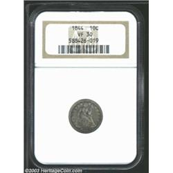 1844 10C VF30 NGC. The borders have traces of russet patina, while the remainder of the relatively u