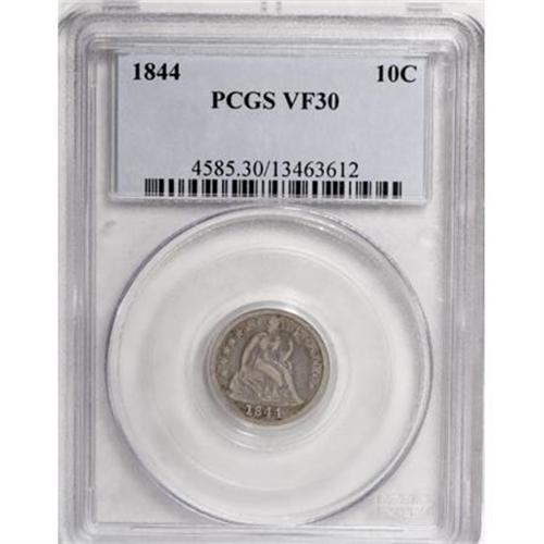<B>1844 10C VF30 PCGS.</B></I> A moderately worn, yet pleasing example with soft cloud-gray patina on the devices and elements of blue and violet in the fields. Though decades of "Little Orphan Annie" hype have jaded numismatists, the 1844 dime is a legitimately elusive issue with a mintage of only 72,500 pieces. Population: 9 in 30, 37 finer (8/07).<BR><BR><B>Coin Engraver:</B> Christian Gobrecht<BR><BR><b>Shipping:</b> Coins & Currency (<a target="_blank" href="http://www.heritageauctions.com/common/shipping.php">view shipping information</a>)