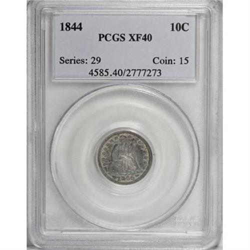 <B>1844 10C XF40 PCGS.</B></I> The low mintage 1844 has long been hoarded, ever since it was promoted as the "Little Orphan Annie" dime by Frank C. Ross several generations ago. Powder-blue and cream-gray toning alternate across the moderately abraded surfaces. Also included are 14 periodicals that cover the legendary Little Orphan Annie dime. Most are <I>Hobbies</B></I> magazines from the early 1930s to the 1950s. There are also three <I>Numismatic Scrapbook </B></I>magazines, a 1955 <I>Numismatist</B></I>, and a clipped article by Frank Ross.<BR><BR><B>Coin Engraver:</B> Christian Gobrecht<BR><BR><b>Shipping:</b> Coins & Currency (<a target="_blank" href="http://www.heritageauctions.com/common/shipping.php">view shipping information</a>)