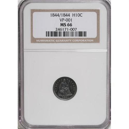 <B>1844/1844 MS66 NGC.</B></I> FS-301, formerly FS-000.063. VP-001. The date is repunched both north and south, most noticeably beneath the 8. Deep emerald-blue, almond-tan, and lime-green consume this virtually mark-free Premium Gem. Well struck aside from a few denticles near 7 o'clock on the obverse and opposite at 11 o'clock on the reverse. NGC FS-301 census: 1 in 66, 0 finer (11/07).<BR><BR><B>Coin Engraver:</B> Christian Gobrecht<BR><BR><b>Shipping:</b> Coins & Currency (<a target="_blank" href="http://www.heritageauctions.com/common/shipping.php">view shipping information</a>)