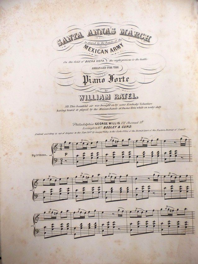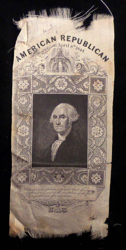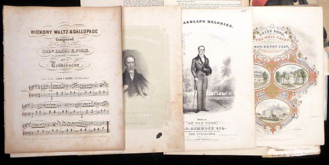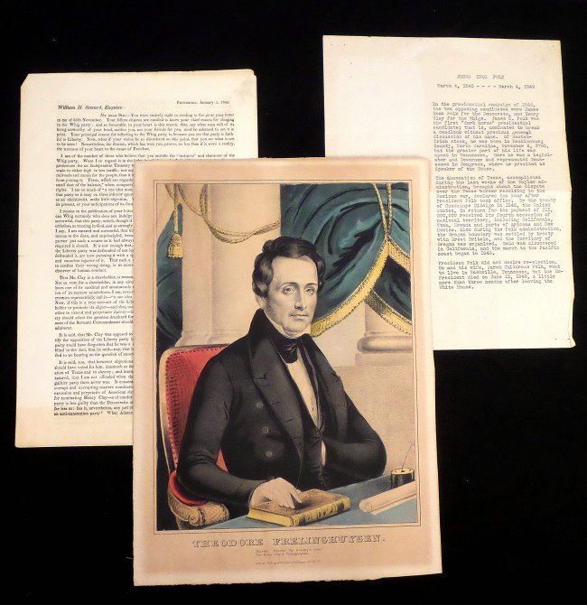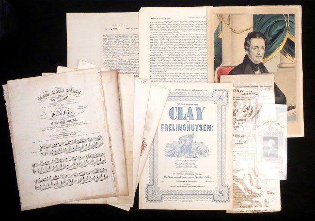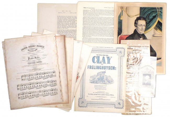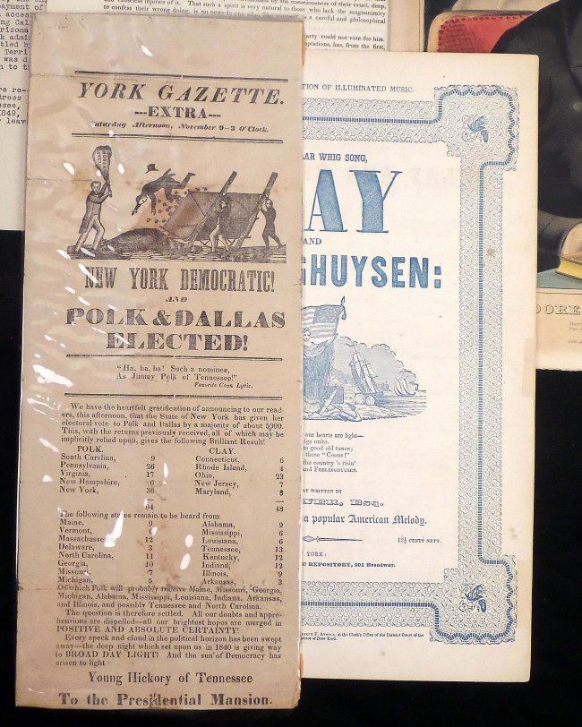 Comprises 1.) Imprinted silk ribbon "American Republican / ...April 8, 1844." Features a rectangular portrait of George Washington. At bottom bears a quote warning against foreign influence. "Sold by E.P. Whaites 1 Cortlandt St. N.Y." [3" W x 6" H]. Toning, fraying at top and bottom edges, stains, and creases with one tear affecting text. 2.) Newspaper handbill "York Gazette" announcing the election victory of Polk and Dallas to the Presidency and Vice Presidency of the United States [5-2/4" W x 14-1/4" H]. Toning, stains, creases, fold wear with short tears. 3.) Nathaniel Currier color lithograph portrait of Theodore Frelinghuysen [Image: 11-1/2" H x 8-3/4" W on larger sheet]. Toning. 4.) Printed circular letter signed, in type, "Garrit Smith," tall 4to, 2-3/4 pages. Addressed to "William H. Seward, Esquire," Smith remarks on the viability of Henry Clay as a presidential candidate. Uneven age toning and fold wear with short tears. 5). Two large 4to printed sheet music compositions, relating to James K. Polk. Together with four large 4to printed sheet music compositions, related to Henry Clay. Condition varies widely, all sold as is.