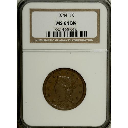 1844 1C MS64 Brown NGC. N-7, R.2. The cherry-brown sur