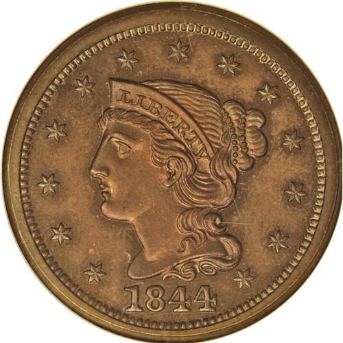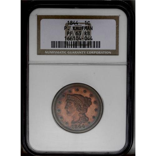 <B>1844<1C> PR63 Red and Brown NGC.</B></I> N-8, High R.6. Ex: P. Kaufman. We can only assume the die engraver had a bad night, or perhaps a little too much rum while he was working, for the first attempt at placing the date in this coinage die completely missed the proper position along the obverse rim. The upper serif from a stray digit 1 can be seen protruding from the upper curve of the bust line, and the top of a misplaced 8 is visible on Liberty's bust.<BR> Possibly as many as a 14 or 15 examples of this proof-only date are known today. This example is a pleasing proof with lovely orange color, fading to light brown on each side. A hint of blue toning adds to the overall aesthetic appeal of this delightful proof cent. EAC PR63.