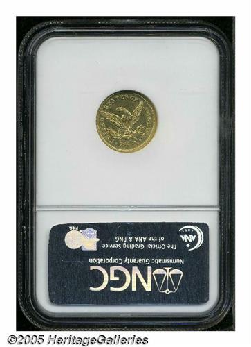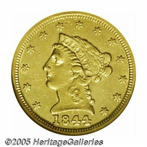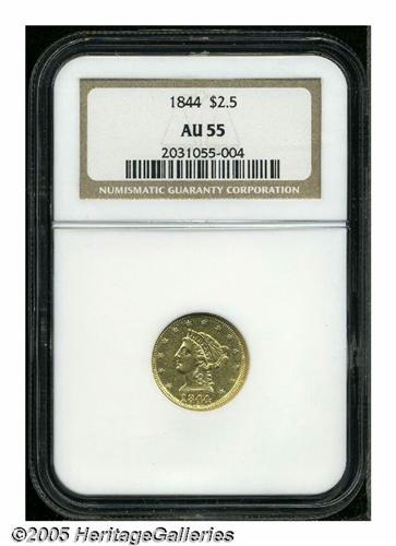 <B>1844<$2 1/2> AU55 NGC.</B></I> The 1844 Quarter Eagle is an underappreciated rarity in all grades and is particularly challenging in grades even approaching Mint State. When offered at all, this issue of just 6,784 pieces is apt to grade no finer than a low-end AU. Offered here is a bright, lustrous green-gold example with a touch of striking softness on the major devices. Population: 12 in 55, 8 finer (4/05).