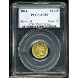 <table><tr><td><TABLE cellSpacing=0 cellPadding=0 width="100%" bgColor=#000000 border=0><TBODY> <TR><TD width="100%"><TABLE cellSpacing=1 cellPadding=3 width="100%" border=0><TBODY><TR><TD width="100%" bgColor=#79735c><FONT face=arial color=#ffffff size=3><B>Description</B> </FONT></TD></TR><TR><TD width="100%" bgColor=#ffffff><FONT face=arial size=2><B>1844 $2 1/2 AU55 PCGS.</B></I> A much above average example of this rare Philadelphia issue, one of just 6,784 pieces struck. The few surviving pieces generally grade Fine to VF or, on occasion, XF at best. The strike, particularly on the obverse, is quite strong and only a minor amount of softness is noticed on the eagle's neck and left (facing) leg. The surfaces are light in color and retain at least half of the original mint luster. As an identifier, a small curving mark is seen from Liberty's eye to her hair. Population: 6 in 55, 2 finer (10/03). </FONT></TD></TR></TBODY></TABLE></TD></TR></TBODY></TABLE><BR><A name=PricesRealized></A><TABLE cellSpacing=0 cellPadding=0 width="100%" bgColor=#000000 border=0><TBODY><TR><TD width="100%"><TABLE cellSpacing=1 cellPadding=3 width="100%" border=0><TBODY><TR><TD width="100%" bgColor=#79735c><A name=PR><FONT face=arial color=#ffffff size=3><B>Previous Prices from Heritage Auctions</B> </FONT></A></TD></TR><TR><TD bgColor=#f6f6ed><TABLE cellSpacing=0 cellPadding=0 width="100%" border=1><TBODY><TR><TD align=middle width="33%"><B>Date</B></TD><TD align=middle width="33%"><B>Service</B></TD><TD align=middle width="33%"><B>Price</B></TD></TR><TR bgColor=whitesmoke><TD width="33%"><B>10/01/1999</B></TD><TD width="33%">PCGS</TD><TD width="33%">$6,325.00</TD></TR></TBODY></TABLE></TD></TR><TR><TD bgColor=#ffffff><FONT face=arial size=1 ?>PLEASE NOTE: All prices realized reflect the final hammer price PLUS the buyer's premium in auctions that charge a buyer's premium. Each item has a notation at the top of the listing indicating whether that lot included a buyer's premium. Example: A item that sells with a final hammer price of $100 and a 20% buyer's premium will display with a price realized of $120. All information listed is intended to be as accurate as possible, but errors are possible. Please use this guide carefully and inform us of any inaccuracies. </FONT></TD></TR></TBODY></TABLE></TD></TR></TBODY></TABLE><BR><TABLE cellSpacing=0 cellPadding=0 width="100%" bgColor=#000000 border=0><TBODY><TR><TD width="100%"><TABLE cellSpacing=1 cellPadding=3 width="100%" border=0><TBODY><TR><TD width="100%" bgColor=#79735c colSpan=6><FONT face=arial color=#ffffff size=3><B>Price Guide*</B> </FONT></TD></TR><TR bgColor=#f6f6ed><TD align=middle><B>Grade</B> </TD><TD align=middle><B>Coin World<BR>(Trends)</B> </TD><TD align=middle><B>Numismedia<BR>Retail</B> </TD><TD align=middle><B>Numismedia<BR>Wholesale</B> </TD><TD align=middle><B>Coin<BR>Universe</B> </TD><TD align=middle><B>Heritage<BR>Value Index</B> </TD></TR><TR bgColor=#ffffff><TD align=middle>53</TD><TD align=right>---</TD><TD align=right>---</TD><TD align=right>$2,175.00</TD><TD align=right>---</TD><TD align=right>$2,184.89</TD></TR><TR style="FONT-WEIGHT: bold" bgColor=#cccfdd><TD align=middle>55</TD><TD align=right>$3,950.00</TD><TD align=right>---</TD><TD align=right>$4,050.00</TD><TD align=right>$2,850.00</TD><TD align=right>$2,636.67</TD></TR><TR bgColor=#ffffff><TD align=middle>58</TD><TD align=right>---</TD><TD align=right>---</TD><TD align=right>---</TD><TD align=right>---</TD><TD align=right>$4,203.00</TD></TR><TR bgColor=#ffffff><TD colSpan=6><FONT size=1>*All information listed is intended to be as accurate as possible, but errors are possible. No item may be returned or refused based on this information which is provided as a service to our customers. You should contact each pricing source directly to determine the accuracy of this information. </FONT></TD></TR></TBODY></TABLE></TD></TR></TBODY></TABLE><BR><TABLE cellSpacing=0 cellPadding=0 width="100%" bgColor=#000000 border=0><TBODY><TR><TD width="100%"><TABLE cellSpacing=1 cellPadding=3 width="100%" border=0><TBODY><TR><TD width="100%" bgColor=#79735c><FONT face=arial color=#ffffff size=3><B>Population Guide</B> </FONT></TD></TR><TR bgColor=#ffffff><TD align=middle><!-- Begin Output of Population Grid--><TABLE cellSpacing=0 cellPadding=0 width="100%" border=0><TBODY><TR><TD vAlign=center><TABLE cellSpacing=0 width="100%" border=1 cellsadding="3"><TBODY><TR><TD vAlign=center><TABLE cellSpacing=0 cellPadding=3 width="100%" border=1><TBODY><TR><TD vAlign=center align=middle bgColor=#f0f1e8 colSpan=2 <CENTER><FONT face=Arial size=2><B>PCGS Pop </B></FONT><CENTER></CENTER></TD><TD vAlign=center align=middle bgColor=#f0f1e8 colSpan=2><CENTER><FONT face=Arial size=2><B>NGC Pop</B></CENTER></FONT></TD></TR><TR><TD vAlign=center><FONT face=Arial size=2>(55)</FONT> </TD><TD vAlign=center align=right><FONT face=Arial size=2>6</FONT> </TD><TD vAlign=center><FONT face=Arial size=2>(55)</FONT> </TD><TD vAlign=center align=right><FONT face=Arial size=2>8</FONT> </TD></TR><TR><TD vAlign=center><FONT face=Arial size=2>(>55)</FONT> </TD><TD vAlign=center align=right><FONT face=Arial size=2>2</FONT> </TD><TD vAlign=center><FONT face=Arial size=2>(>55)</FONT> </TD><TD vAlign=center align=right><FONT face=Arial size=2>6</FONT> </TD></TR></TBODY></TABLE></TD></TR></TBODY></TABLE></TD></TR></TBODY></TABLE><!-- End Output of Population Grid--></TD></TR></TBODY></TABLE></TD></TR></TBODY></TABLE><BR><TABLE cellSpacing=0 cellPadding=0 width="100%" bgColor=#000000 border=0><TBODY><TR> Important notice: Heritage usually auctions material at the rate of 200-250 lots per hour. On some occasions eBay Live bid software or the Internet may not be able to keep up with the pace of the auction. We recommend placing a realistic absentee bid now as insurance to avoid disappointment. Occasionally the auctioneer may eliminate or reject an eBay Live bid, and the auctioneer may also reopen a lot after the close of the eBay live