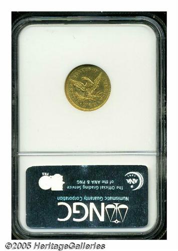 <B>1844<$2 1/2> AU58 NGC.</B></I> Over the last 12 years, we have only handled 15 examples in previous sales, and only two of those were graded fully Mint State. This is a surprisingly difficult date to locate. It is perhaps the case that Proof examples of this date are as plentiful as Mint State coins. This is a lovely example with rich honey-gold luster and slightly reflective fields. Population: 5 in 58, 4 finer (5/05).