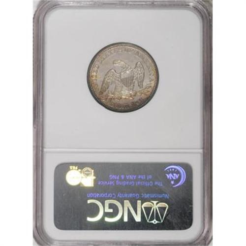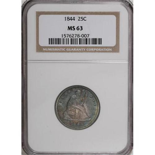 <B>1844 25C MS63 NGC.</B></I> A well-defined Select example that offers soft, pleasing luster beneath the blue-green and orange patina of the obverse. Similar, subtler shadings grace the reverse margins. Wispy abrasions are present in the fields of this otherwise pleasingly preserved coin. Census: 9 in 63, 7 finer (1/08).<BR><BR><B>Coin Engraver:</B> Christian Gobrecht<BR><BR><b>Shipping:</b> Coins & Currency (<a target="_blank" href="http://www.heritageauctions.com/common/shipping.php">view shipping information</a>)