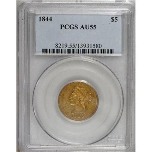 <B>1844 $5 AU55 PCGS.</B></I> PCGS Population (19/37). NGC Census: (47/105). Mintage: 340,330. Numismedia Wsl. Price for NGC/PCGS coin in AU55: $400. (#8219)<BR><BR><B>Coin Engraver:</B> Christian Gobrecht<BR><BR><b>Shipping:</b> Coins & Currency (<a target="_blank" href="http://www.heritageauctions.com/common/shipping.php">view shipping information</a>)