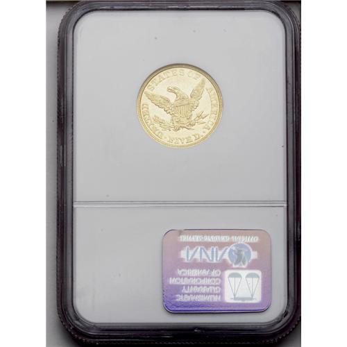 <B>1844<$5> AU58 NGC.</B></I> The 1844 is considerably scarcer than both the 1843 and the 1847, and is generally encountered in VF or lower condition. This piece has lovely green-gold surfaces and is sharply struck throughout. Numerous tiny marks are seen on each side. The barest trace of rub across the highpoints separates this near-Mint example from a Mint State grade. Census: 67 in 58, 30 finer (4/06).
