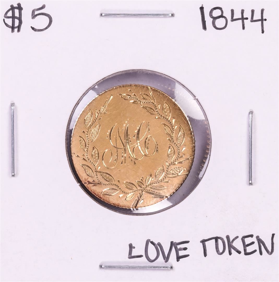 One 1844 $5 Liberty Head Half Eagle Love Token Coin Pin.