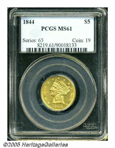 1844 $5 MS61 PCGS. Smooth, creamy luster sits on