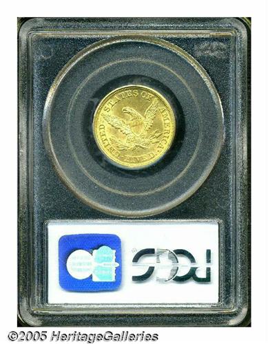 <B>1844<$5> MS61 PCGS.</B></I> Smooth, creamy luster sits on both sides. The color, a consistent green-gold is very nice and the marks, while numerous, are scattered and minor. Extremely attractive, considering the grade.