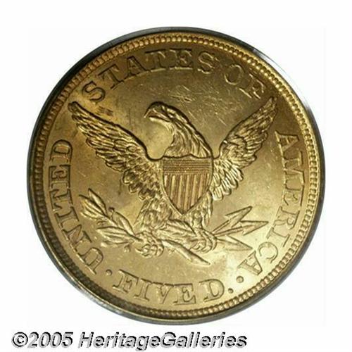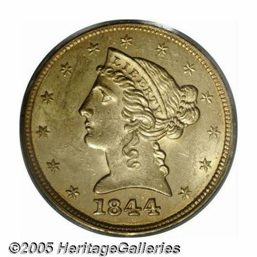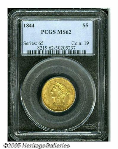1844 $5 MS62 PCGS. Boldly detailed with a soft, f