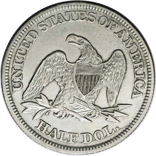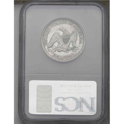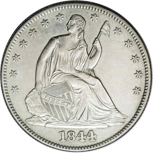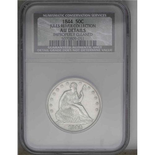 <B>1844<50C>--Improperly Cleaned--NCS. AU Details.</B></I> Assertively struck aside from the eagle's left (facing) claw, this bagmark-free example is essentially untoned and has noticeable luster in the open fields. Friction is limited to Liberty's thigh, and the past cleaning is mild and inoffensive.