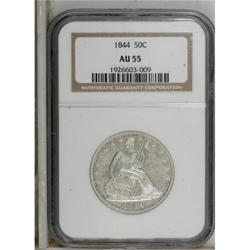 <B>1844 50C AU55 NGC.</B></I> NGC Census: (16/124). PCGS Population (11/49). Mintage: 1,766,000. Numismedia Wsl. Price for NGC/PCGS coin in AU55: $275. (#6245)<BR><BR><b>Shipping:</b> Coins & Currency (<a target="_blank" href="http://www.heritageauctions.com/common/shipping.php">view shipping information</a>)