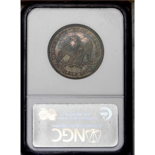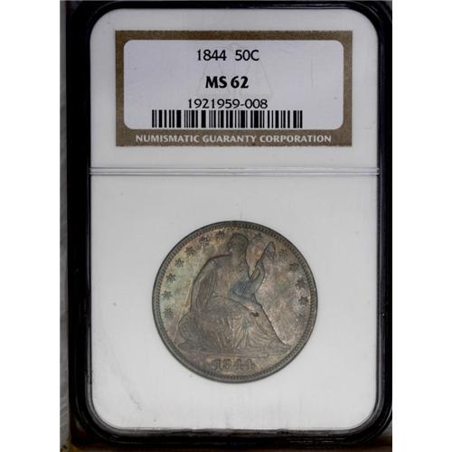 <B>1844<50C> MS62 NGC.</B></I> This well struck example is deeply toned in sea-green, plum, and coffee-brown colors. A couple of wispy handling marks are beneath the eagle's beak, but this example is generally unblemished. A spot is noted below the right knee. An arc-shaped reverse die crack between 2 and 6 o'clock includes a die break within the shield. Census: 10 in 62, 23 finer (3/06). <BR><BR><B>Important notice:</B> Heritage usually auctions material at the rate of 200-250 lots per hour. On some occasions eBay Live bid software or the Internet may not be able to keep up with the pace of the auction. We recommend placing a realistic absentee bid now as insurance to avoid disappointment. Occasionally the auctioneer may eliminate or reject an eBay Live bid, and the auctioneer may also reopen a lot after the close of the eBay live bidding (usually because we missed an audience bid), and may reject your bid even if it shows you as the winning bidder. By bidding via eBay Live, you agree that Heritage may award the lot to another bidder at its sole discretion under the circumstances described above or any other reasonable circumstances. Since eBay bids are not shown to us until we open the lot on the floor, we treat those bids just like floor bids. In most cases the floor responds before the eBay bid is presented to us, due to Internet lag time, so for consistency we have made it a policy that floor bids are always considered first over tie eBay live bids. Also please note that all Heritage lots purchased through eBay Live carry a 20% Buyer's Premium. Please make sure you read the Terms and Conditions before you bid. This lot is being auctioned in conjunction with a live floor auction by Heritage Galleries & Auctioneers. All final auction and invoice information will be supplied by Heritage Galleries & Auctioneers, and all other information should be considered preliminary. Lot:1985 <BR><BR><B>Winning Notification and Billing:</B> After the FINAL session in this auction is complete, Heritage will send e-mail and snail mail invoices. This process normally takes several days. All final auction and invoice information will be supplied by Heritage Galleries & Auctioneers, and all other information should be considered preliminary. <BR><BR>This auction will be conducted on a live auction floor and over the Internet through eBay Live. If you choose to place an absentee bid, please take a moment to <font color='#0000ff'><u><a href='http://pages.ebay.com/liveauctions/help/before/laabsentee.html'>learn how eBay Live absentee bidding works</a></u></font><font color='#000000'>