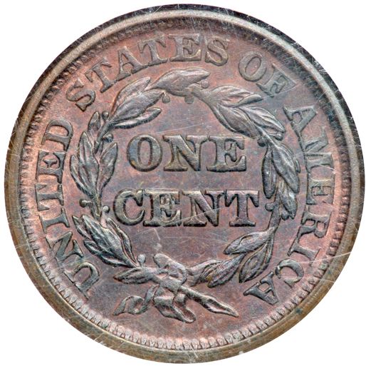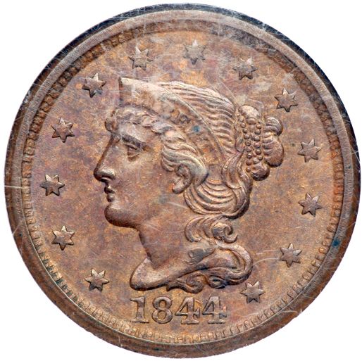 1844/81 N-2 R2 1844 over Inverted 1844 (44 over 81). NGC graded MS-64 Brown. Frosty bluish steel and olive brown with ample lighter brown toning peeking through on the obverse and generous traces of faded mint color remaining on the reverse. The only marks are a small spot of very fine carbon nestled inside the top of the R in LIBERTY and another on the rim at star 11.5, plus a few extremely faint ticks on the cheek. The strike is decent for this variety, which never comes fully impressed, but there is still some weakness on the coronet over LIB and at the top of the ear making it difficult to determine if there is any friction in those places. For that reason, our grade on this cent is AU58 rather than MS60, but the reverse is clearly mint state. MDS, die state b. Thanks to the high grade of this piece, evidence of the initially inverted date is visible on all 4 digits, clearest on the 44 where the inverted 18 appears as "81." Regardless of the moniker commonly used to identify the variety, this is an important cent for the collector of "Redbook" varieties. The attribution and 44 over 81 feature are noted on the NGC label.