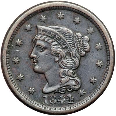 1844/81 N-2 R2. VF-30. Blundered Date 44 over Inverted 81. Ten points sharper with extremely faint roughness under a rather glossy dark olive and steel patina. No marks or verdigris. E-MDS. The blundered date 44 over 81 feature is obvious.
