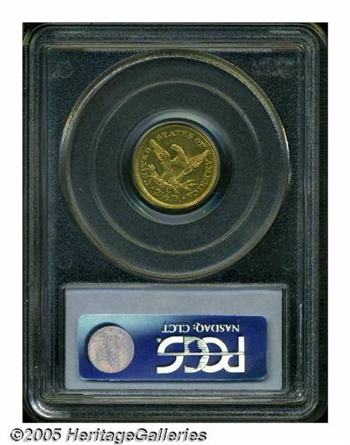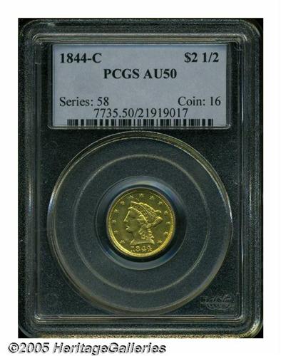 <B>1844-C<$2 1/2> AU50 PCGS.</B></I> Variety 6-E. A bright and typically struck apricot-gold representative of this rare Charlotte Mint issue. Faint slide marks are detected on the lower left obverse field, and a few nearly imperceptible file marks on the obverse rim near 2 o'clock are mentioned for accuracy. A scant 11,622 pieces were produced, and only a small fraction among these have survived to the present day. Population: 8 in 50, 26 finer (3/05).