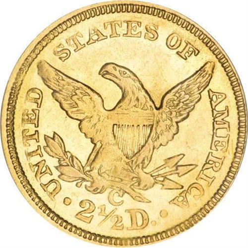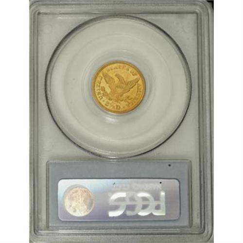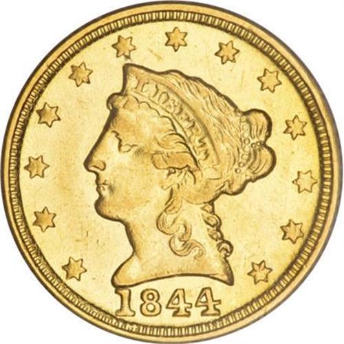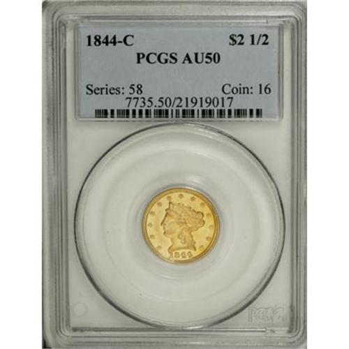 <B>1844-C $2 1/2 AU50 PCGS.</B></I> Variety 6-E. A bright and typically struck apricot-gold and mint-green representative of this rare Charlotte Mint issue. The lower left obverse quadrant has a few faint hairlines, and the obverse rim near 2 o'clock has nearly imperceptible file marks. A scant 11,622 pieces were produced, and only a small fraction among these have survived to the present day. Population: 8 in 50, 33 finer (11/07).<BR><BR><B>Coin Engraver:</B> Christian Gobrecht<BR><BR><b>Shipping:</b> Coins & Currency (<a target="_blank" href="http://www.heritageauctions.com/common/shipping.php">view shipping information</a>)