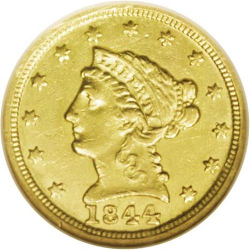 <B>1844-C<$2 1/2> AU55 NGC.</B></I> Variety 6-E. A radiant straw-gold Choice AU representative with attractive surfaces for the grade. The strike is slightly soft on the left side stars and on the eagle's shield, but Liberty's hair is sharp, as is the eagle's left (facing) wing. A scant 11,622 pieces were struck. Census: 16 in 55, 20 finer (8/06).