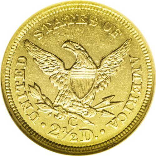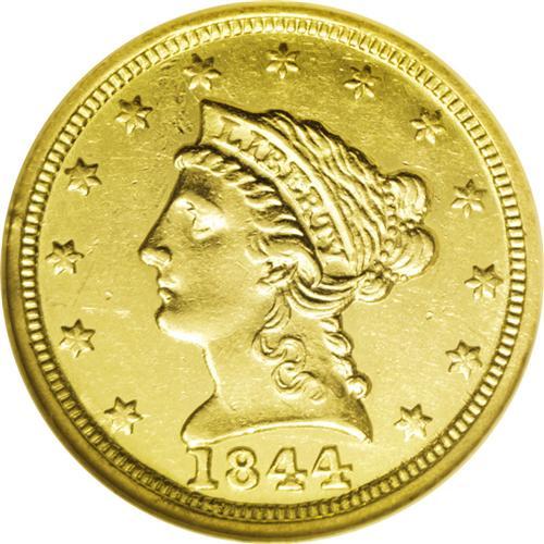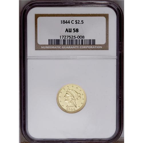 <B>1844-C $2 1/2 AU58 NGC.</B></I> Variety 6-E. The 1844-C is mainly found in lower grades because it saw heavy circulation for the following reasons: by 1844, public confidence in Bechtler gold coins decreased, and a July 28, 1844 fire in the Charlotte Mint halted production until 1846. Pressure was placed on the already small mintage of 11,622 pieces, meaning that few high-grade coins survived. In fact, only 20 specimens have been certified AU58 by both services combined, and 14 examples finer. The present coin displays bright brass-gold surfaces that retain considerable luster. The design elements are well brought up, and just a few minute marks are scattered about. Census: 9 in 58, 10 finer (1/06).
