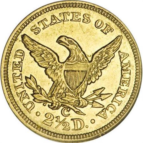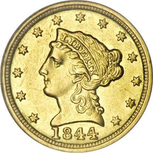 <B>1844-C $2 1/2 AU58 NGC.</B></I> Variety 6-E. The 1844-C is mainly found in lower grades, because it saw heavy circulation. By 1844, public confidence in Bechtler gold coins decreased, and a July 28, 1844 fire in the Charlotte Mint halted production until 1846. Pressure was placed on the already small mintage of 11,622 pieces, meaning that few high-grade coins survived. In fact, only 25 survivors have been certified at AU58 by both services combined, and a mere 16 examples finer. The present coin displays bright brass-gold surfaces that retain considerable luster. The design elements are well brought up, and just a few minute marks and wispy hairlines are noted on each side. NGC Census: 12 in 58, 11 finer (11/07). <BR><BR><B>Coin Engraver:</B> Christian Gobrecht<BR><BR><b>Shipping:</b> Coins & Currency (<a target="_blank" href="http://www.heritageauctions.com/common/shipping.php">view shipping information</a>)