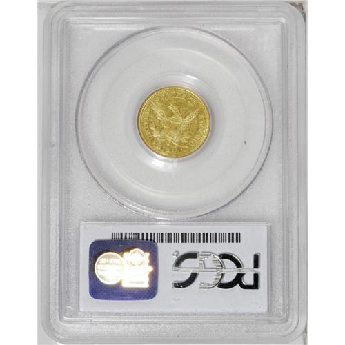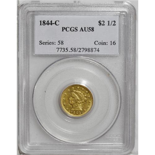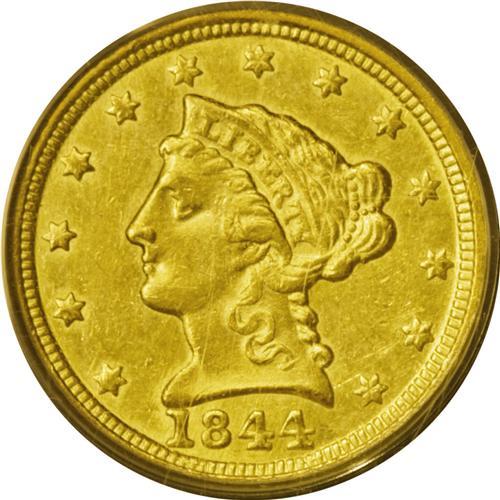<B>1844-C<$2 1/2> AU58 PCGS.</B></I> Variety 6-E. This piece is extremely scarce in Choice XF and very rare in AU, with about two dozen examples known, according to gold guru Douglas Winter. That latter figure correlates nicely with the certified population data from NGC and PCGS, which list 22 examples in AU58, with 14 higher (or <I>submission events,</B></I> as Bowers calls them). This piece is usually found with much-abraded surfaces, and so this coin is a pleasant surprise, as it is only lightly abraded, with greenish-gold surfaces. Just a trace of rub shows on the eyebrow and cheek. The strike is fairly soft through the centers of both sides, but numerous individual strands of hair can be seen above the coronet, and the reverse peripheral strike is excellent. This is a rare opportunity to own this attractive example of a rare issue in such a high grade. Census: 10 in 58, 10 finer (7/06).