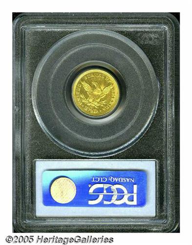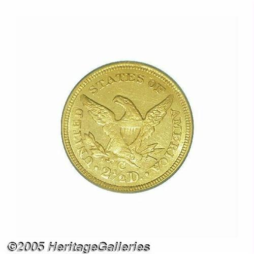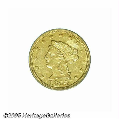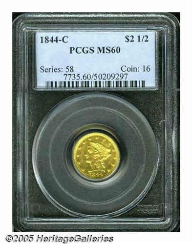 <B>1844-C<$2 1/2> MS60 PCGS.</B></I> Variety 6-E. A fire broke out in the Charlotte Mint on July 28, 1844, forcing mint officials to cease production until early 1846. The absence of a C-mint Quarter Eagle delivery in 1845 resulted in increased public demand for the 11,662 coins delivered in 1844. Consequently, the 1844-C is not only more apt to be well circulated, but it is also one known as one of the worst produced issues from the Charlotte facility. This extremely scarce Uncirculated example does not lack for luster, being semi-reflective in finish with normal striking softness over the major devices. Population: 1 in 60, 3 finer (6/05).