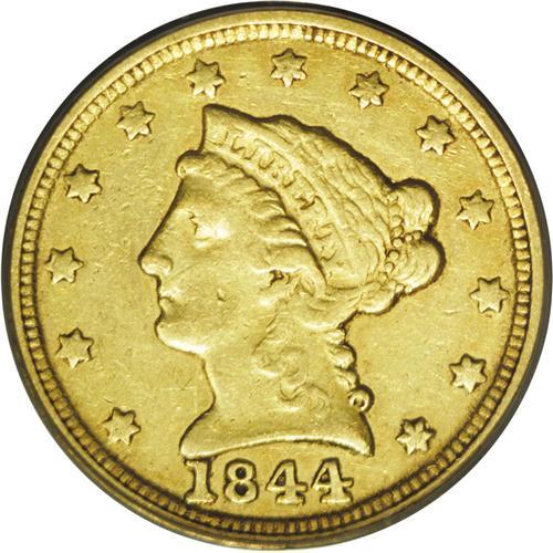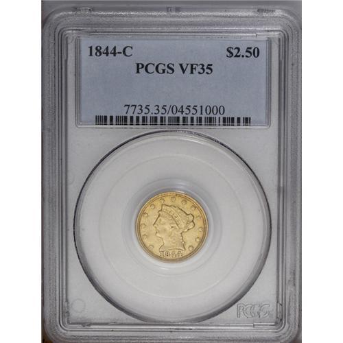 <B>1844-C $2 1/2 VF35 PCGS.</B></I> Variety 6-E. A subdued chestnut-brown Charlotte quarter eagle that lacks relevant marks. The reverse margin has a few shallow planchet flaws, as made, and the strike is only average, although the eagle's wings and the hair above the coronet show pleasing definition.<BR><I>From The Carolina Gold Collection, Part Two.</B></I>
