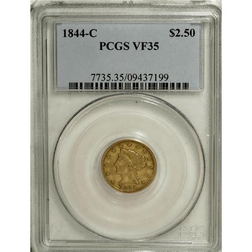 <B>1844-C $2 1/2 VF35 PCGS.</B></I> Variety 6-E, the only known die variety for this date. A pleasing, moderately worn example with excellent surfaces for the grade. This was the final Charlotte Mint quarter eagle production before a fire halted production at that facility in the summer of the following year.<BR><BR><b>Shipping:</b> Coins & Currency (<a target="_blank" href="http://www.heritageauctions.com/common/shipping.php">view shipping information</a>)