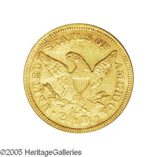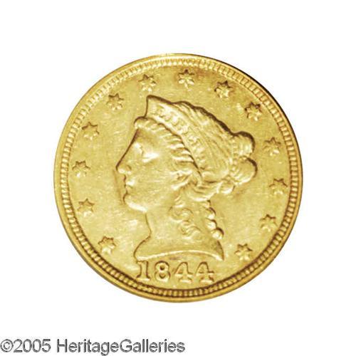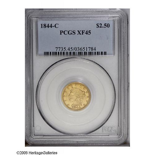 <B>1844-C<$2 1/2> XF45 PCGS.</B></I> Variety 6-E. A typically struck (bluntness in the centers) '44-C quarter eagle that is bathed in reddish patina particularly on the reverse. There is some surviving luster and abrasions are minimal. Just 11,622 pieces were struck and appreciably finer survivors can be accurately labeled as very scarce.<BR><I>From The Carolina Gold Collection.</B></I>