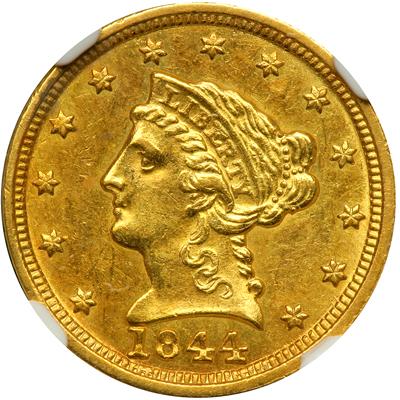 1844-C $2.50 Liberty. NGC graded MS-61. Well struck on a problem-free planchet, all lightly toned. A total of only 11,622 minted. One of the finest known. Fairly lustrous, intermingled with original orange-gold patina (indicating long careful storage away from harmful elements). A high quality Mint State seldom seen among quarter eagles of this date and mint. High Condition Census.