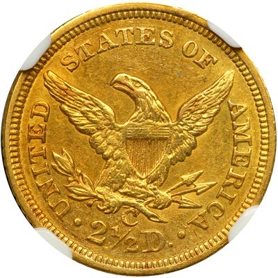 The date logotype of 1844-C is very deeply punched into the die, and to the left. The top of the 1 touches the base of the neck truncation, while the lower left serif of the 1 touches a dentil. On the reverse the mintmark is large and high, embedded in the arrow feather, with a small part of the feather visible within the upper curve. Pop 5; 5 better in 62 In a new NGC 4 pronged holder (PCGS # 7735).