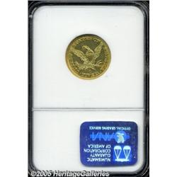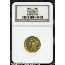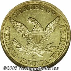 <B>1844-C $5 AU58 NGC.</B></I> Variety 7-D. A later die stage with a crack from the rim through the first A in AMERICA, through the eagle's right (facing) wing, to the eagle's neck. Crisply struck aside from the right (facing) claw. A few noticeable contact marks show on the obverse, but the surfaces are generally unabraded. Abundant luster remains on each side. Population: 10 in 58, 6 finer (2/05).