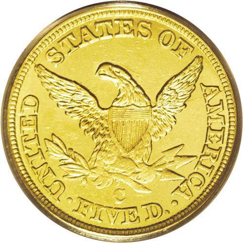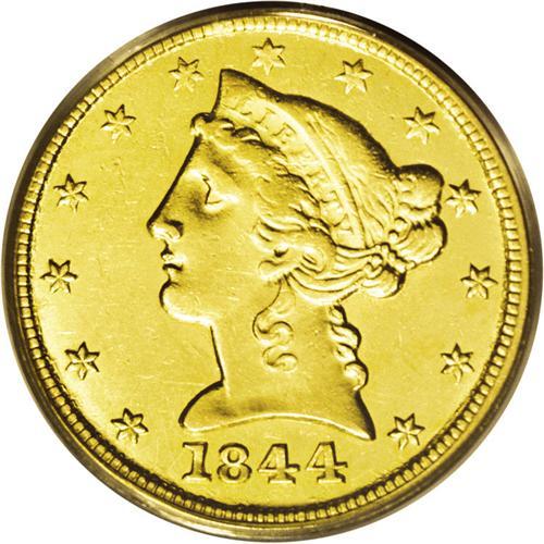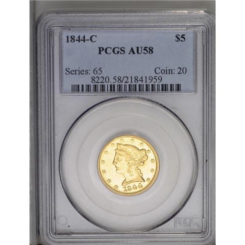 <B>1844-C<$5> AU58 PCGS.</B></I> Variety 7-D. A refreshingly smooth yellow-gold example of this popular low mintage issue. Bright luster is plentiful on each side. Portions of Liberty's hair and the bottom half of the eagle are softly defined. A bold horizontal die crack travels from the eagle's neck to the reverse rim at 2:30. Population: 4 in 58, 4 finer (6/06).